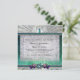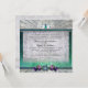 Pavão de vidro esmeralda com sopro de diamante e penas esmeraldas acentos com penas de rendas brancas enroladas sobre uma fita esmeralda. Painel de rendas com borda de pérolas. As flores do lilac brilham em folhas de palha e pavão contra um fundo brilhante de esmeralda.