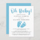 Este simples convite para chás de bebês, amigável em orçamento, apresenta "Oh Baby!" num roteiro de pincel azul e na moda e uma coordenada cor azul de água dos pés dos bebês. Você pode personalizar facilmente com os detalhes do chá on-line, incluindo um link de acesso on-line, informações do registro, onde enviar cartões e presentes ou a opção de abrir on-line e enviar posteriormente, e onde obter mais informações.