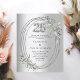 Um fundo de olhar mal prateado. Uma moldura de prata oval decorada com um verde de sábado. Personalize e adicione seus nomes, detalhes. Texto preto. 1 folha = 1 convite impresso de borda a borda.