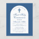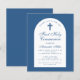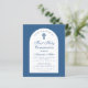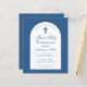 Um convite de primeira comunhão moderno. Sobre um fundo azul clássico, tem um arco branco com texto azul no interior. A ocasião e o nome são escritos em uma fonte caligráfica elegante; a primeira linha é um texto arqueado.