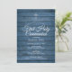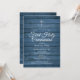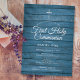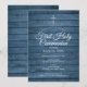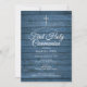 Um convite de primeira comunhão rústica com os detalhes personalizados especiais em tipografia sofisticada sobre um fundo de painéis de madeira azul. Concebido por Thisisnotme©