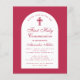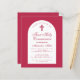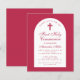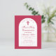 Um convite para a primeira comunhão de uma menina. Em uma cor moderna entre magenta e vermelho, tem um arco branco com texto em vermelho magenta dentro. A ocasião e o nome são escritos em uma elegante fonte caligráfica; a primeira linha é um texto arqueado.
