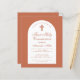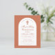 Um convite de primeira comunhão para um menino. Em uma cor moderna. terracota marrom, tem um arco branco com texto terracota dentro. A ocasião e o nome são escritos em uma elegante fonte caligráfica; a primeira linha é um texto arqueado.