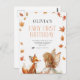 Convite de Primeiro Aniversário da Fada de Outono com uma Raposa e uma fada com asas e folhas de outono