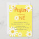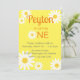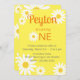As margaridas brancas brilhantes adoram este belo convite para o primeiro aniversário do bebê. Cartão amarelo claro com tipografia laranja