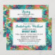 Chamadas de fim de semana de bachelorette sobre temas tropicais- Lê 'Por favor, junte-se a nós' com 'Bachelorette Weekend' no topo em um roteiro elegante e teal com um olhar de sombra. Folhas tropicais de fundo das folhas das palmeiras e das folhas das bananas em tons de verão de chá, aqua, turquesa, verde, laranja e vermelho. Personalizado com o nome de convidado de honra em correspondência de chalé com sombra. As informações personalizadas do fim de semana das meninas, incluindo detalhes de RSVP, são impressas em cartazes modernos. O dorso tem folhas tropicais coloridas de fundo. Informações itinerárias detalhadas para cada dia pronto para ser personalizado. Convites divertidos e modernos à festa de solteira prontos para serem personalizados com seus próprios detalhes de fim de semana de fuga. Perfeito para uma viagem de festa de solteira ao Havaí, ao Caribe ou ao México. Complementa casamentos modernos, casamentos tropicais, temas de casamento de destino, casamentos de verão e cores elegantes de casamento teal. Temos mais convites para a fuga de Festas de solteira no nosso compro Zazzle.com/angela65*.