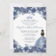 Convite para Quinceañera Azul Floral Elegante. Um adorável design de aquarela com rosas azuis e azuis marinhos e flores misturados com folhas verdes claras estabelece a cena para a sua celebração com a Quinceañera. A frente exibe uma mistura de fontes clássicas de serif e lindas de script em um estilo caprichoso mas elegante, complementado por uma princesa azul-brilho tiara. A parte traseira apresenta uma ilustração de um simples conjunto cintilante azul esmaecido contra um fundo branco nítido, criando um contraste fresco e impressionante. Totalmente personalizável, você pode ajustar as cores da fonte e o plano de fundo para se adequar ao seu tema. Disponível como um convite impresso ou um convite digital para download para e-mail ou impressão local!