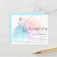 Vestido De Vestido Azul Quinceanera. Um alternativo MENOR de 4,5" x 5,6", compatível com o orçamento. Disponível em um STOCK de PLACA SEMI GLOSS 110 lb ou um STOCK de PAPEL THINNER SATIN FINISH 80 lb. Os envelopes são um extra opcional. Um design de Quinceanera contemporâneo com uma ilustração da visão de trás de uma garota de um lindo vestido azul. O cabeçalho principal está em um script definido e personaliza facilmente o resto do texto para seus detalhes. Um fundo azul de coordenação também está atrás.