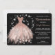 Aqui está um belo e elegante convite para aquela importante Quinceanera! Apresenta um vestido brilhante e cintilante em tons de cor-de-pêssego rosa rodeados por estrelas prateadas brilhantes. Seu texto personalizado está em prata e rosa pálido no lado direito. Tudo é colocado num fundo negro dramático. O verso do convite também é preto, com o coração prateado tiara e calçados de salto alto, novamente cercados por estrelas prateadas. Que linda, como ela é!