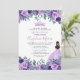 Convite para Quinceanera Floral Puro de Tiara Watercolor Rosa. Uma adorável cor d'água, rosas roxas e flores misturadas com folhas verdes e folhagem, define a cena para esse tema da festa Quinceañera. Um olhar simples, mas caprichoso, com uma variedade de matizes roxos. Uma mistura de fontes serif clássicas e uma bela tipografia de script tornam isto elegante e divertido. Uma princesa brilhante púrpura tiara brilha em cima e atrás, assim como uma garota adorável com um vestido brilhante púrpura. Você pode mudar todas as cores da fonte para torná-la mais colorida ou vibrante se quiser. Você também pode mudar o plano de fundo e a cor do convite para qualquer coisa que quiser. Disponível como um convite impresso ou como um convite digital para download que você pode enviar por e-mail ou que foi impresso localmente!