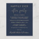 Convite de recepção de casamento azul-marinho econômico. A frente apresenta "Festa do Feliz Para Sempre" em uma mistura de tipografia dourada simples e um elegante texto dourado com floreios e seus nomes em uma escrita semelhante a uma assinatura. No verso, adicione o endereço do site do seu casamento para criar um código QR para que os convidados o leiam e mantenham-se atualizados com as suas fotos de casamento, todos os detalhes e respondam online, e adicione seus primeiros nomes e as datas do casamento e da recepção.