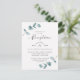 Convites de casamento com roteiro de moldura minimalista simples de eucalipto. Perfeito para o seu tema de casamento de jardim ou ar livre na primavera ou verão. Em uma paleta de cores suaves e sutis de tons de verde aqua, menta pastel, cinzas azulados empoeirados e branco clássico simples. A fonte de caligrafia elegante é destaque para a palavra Recepção. Este design é perfeito para um casamento de fazenda, country ou jardim. Convites simples de eucalipto são fáceis de personalizar com este modelo para papelaria de casamento DIY e acessível.