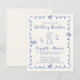 Convite de orçamento para recepção de casamento com creme claro e caprichoso com uma moldura ondulada em azul francês adornada com laços, ilustrações desenhadas à mão de corações e taças de champanhe, e "Recepção de Casamento" e os nomes da noiva e do noivo em um script azul divertido e alegre. NOTA: Este papel econômico é fino, semelhante em peso ao papel fotográfico - uma versão com papel-cartão tradicional 5x7 maior e mais grosso também está disponível (envie-nos uma mensagem para o link).