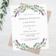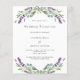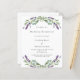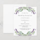 Um fundo branco decorado com flores lavandas e verde de eucalipto. Personalize e seus nomes e detalhes. 1 folha = 1 convite impresso de borda a borda.