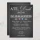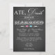 Este convite de recepção de casamento pós-casamento em estilo vintage, com tipografia em lousa de giz preta e branca LOOK, tem uma variedade de fontes com rolos e corações rosa e azul. Tem uma nova abordagem divertida na tendência "Coma, Beba e Case-se", com um jogo de palavras que diz "Comi, bebi e casei-me" para refletir o evento de casamento anterior. É mostrado aqui em papel básico. É facilmente personalizado com suas próprias informações. Há algum texto personalizável que você pode editar da maneira que precisar. ALÉM DISSO, por favor, note que tudo será impresso como aparece no seu monitor. A Zazzle não editará nada para erros de digitação ou desalinhamento, etc., e eu não verei após a sua encomenda. Se precisar de ajuda com a sua redação, por favor, envie-me um e-mail ANTES de encomendar. Se houver outros itens que você precise para tornar o seu evento ainda