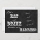 Este convite de recepção pós-casamento apresenta um design de quadro-negro preto e branco com as palavras "Vamos COMER e BEBER porque estamos CASADOS!" na frente, juntamente com um espaço para "escrever" seus nomes de forma inclinada no quadro-negro, junto com a data do casamento. No verso do convite de recepção pós-casamento estão os nomes de solteiro dos noivos e onde eles se casaram, juntamente com os detalhes da recepção pós-casamento. Uma maneira moderna e divertida de convidar seus convidados para uma recepção pós-casamento. Copyright henishouseofpaper