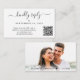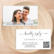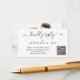 Cartão de resposta de casamento elegante que apresenta "responder gentilmente" em um script swash chique. Insira o endereço do seu site de casamento para criar um código QR para que seus convidados o leiam e respondam online. O lado reverso apresenta sua foto sobreposta com seus primeiros nomes e data de casamento unidos por um coração.