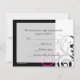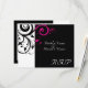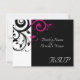 Cartão de RSVP para combinar com o convite de casamento preto e branco com redemoinho magenta reverso, com fundo gráfico em espiral negrito com folhas. Personalize online com os detalhes do seu casamento.