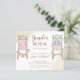 Convite de festa de revelação de gênero do bebê com roupas de bebê rústicas vintage na escada, cores boho. Convite para menino ou menina com orçamento simples