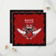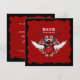 Anuncie o seu casamento com este convite Save the Date não convencional em estilo rock and roll com guitarras elétricas cruzadas, asas e ornamentos vintage em vermelho e preto.