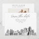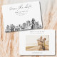 Convite de save the date moderno em preto e branco de Sacramento. A frente apresenta um esboço impressionante, definindo o tom perfeito para o dia do seu casamento. Adicione sua própria foto no verso e personalize o texto para torná-lo seu. Entre na ferramenta de design Zazzle para personalizações adicionais de design.