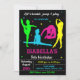 Convite de aniversário de ginástica, convite para Sacudir, convite para garotas. Convide seus amigos com este convite para o tema da ginástica neon silhouettes, meninas brilhantes e coloridas! Este convite de aniversário verde, azul, roxo e amarelo apresenta silhuetas de meninas néon coloridas. Simplesmente edite este menu de personalização fácil de usar modelo para torná-lo especial.