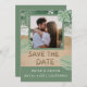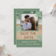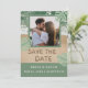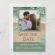 Vibrações modernas de praia em verde sálvia e azul turquesa com foto, letras de areia para salvar a data e foto personalizada. NOTA: Texto, fonte, cores e elementos são totalmente personalizáveis usando a ferramenta de design.