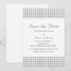 Anúncio de Salvar a Data Houndstooth simples e elegante com um padrão de fundo xadrez cinza e branco na moda. Fácil de personalizar com os detalhes do seu casamento. Para mais opções de personalização, clique no botão Personalizar.