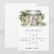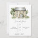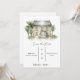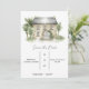 Este é um simples convite de save the date num fundo branco simples com uma pintura de uma mansão no topo. Contém o local, o nome do casal e a data.
