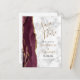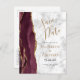 Este elegante cartão-postal moderno de save the date apresenta uma borda de ágata em aquarela borgonha decorada com brilho dourado falso. O texto personalizável em dourado e preto aparece sobre um fundo de mármore cinza e branco. O verso repete as informações, juntamente com um endereço de retorno personalizável.