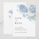 Este design de Save the Date em azul poeirento e branco apresenta flores de hortênsia em aquarela suave com um layout limpo e elegante.