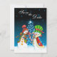 Este anúncio de Save the Date de casamento de férias de inverno apresenta um Boneco de Neve e uma Mulher de Neve encantadores. Eles estão fazendo um coração de canas de hortelã e desfrutando de uma noite de inverno encantadora iluminada por uma árvore de Natal estrelada ao fundo.