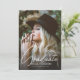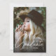 Este convite de festa de formatura elegante e moderno apresenta uma foto do formando, com a moderna escrita branca e o nome do formando, a escola e o ano de aulas de formatura. Retrato do estilo Rustic Boho. A parte traseira do convite contém todas as informações da parte e o local. Substitua o exemplo de foto por sua própria foto de formando. Basta substituir esta foto por sua própria foto formal ou casual que mostra sua própria personalidade.
