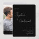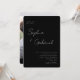 5 horas por dia, 7 dias por semana Convite de casamento simples e mínimo. Texto branco sobre fundo preto. Com a foto de volta. Parte de uma coleção de casamento.