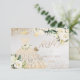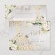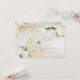 RSVP elegante de quinceanera da PixDezines com flores em aquarela em creme Alabastro e folhagem verde exuberante, um vestido dourado cintilante em lantejoulas douradas.