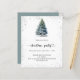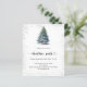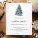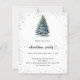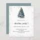 Um convite de inverno para uma festa de Natal. Uma fundo branco na frente decorado com um pinheiro desenhado à mão com aquarela com neve e brilho falso cintilante. Personalize e adicione os detalhes da sua festa.