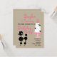 Um convite de aniversário feminino que caracteriza uma ilustração de uma caniche preta com arco e o colar cor-de-rosa saiu no fundo. Ilustração de um bolo de aniversário branco com arcos pretos em um suporte cor-de-rosa do bolo no direito. Personalize o texto cor-de-rosa e preto.