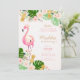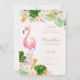 Aloha! Um quadro da aguarela tirada mão convida com um flamingo cor-de-rosa cercado com as flores tropicais e os abacaxis pastel cor-de-rosa e verdes do ouro. Hula afastado com este convite havaiano tropical do luau