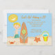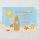 Comece sua celebração fora do direito com esta cena adorável da praia convidar. Se é um partido na praia ou apenas em um tema da praia é perfeito para você. Há areia ao longo da parte inferior com um balde e uma pá nela. Há um sol amarelo brilhante no canto superior com um smiley face. Um menino que está de sustentação seu conselho de surf. Verifique para fora nossos muitos outros design e produtos este em ilustrações de line.© JW