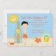 Comece sua celebração fora do direito com esta cena adorável da praia convidar. Se é um partido na praia ou apenas em um tema da praia é perfeito para você. Há areia ao longo da parte inferior com um balde e uma pá nela. Há um sol amarelo brilhante no canto superior com um smiley face. Um menino está estando de sustentação seu conselho de surf. Verifique para fora nossos muitos outros design e produtos este em ilustrações de line.© JW