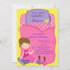 Comece sua celebração fora do direito com esta, brilhante convidam. É grande para um partido do sleepover! Tem um fundo listrado amarelo brilhante. Há um grande saco de sono cor-de-rosa com um travesseiro roxo nele. Uma menina adorável que veste os pijamas do rosa quente que guardaram uma escova de cabelo está sentando-se no canto inferior do saco de sono. Ao lado dela são duas garrafas pequenas do verniz para as unhas: rosa e roxo. Verifique para fora o muito outro design e cores nesta linha assim como obrigado nota, etiquetas, camisas & ilustrações de more.© JW