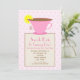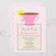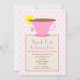 Um convite do aniversário do tea party que caracteriza um esquema de cores cor-de-rosa. Ilustração de um teacup cor-de-rosa com a cunha de limão na parte superior. O fundo em ambos os lados é claro - rosa com bolinhas cor-de-rosa. Personalize o texto cor-de-rosa e preto com detalhes de sua ocasião.