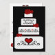 Um bolo de casamento elegante e moderno no branco com ornamento pretos, destaques vermelhos, e rosas vermelhas.