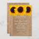 Este convite rústico do casamento é perfeito para todo o casamento ocidental do país. Caracteriza país rústico um fundo impresso de serapilheira em ambos os lados do convite. A parte superior tem três girassóis bonitos. A serapilheira é apenas um design impresso. Não é tecido real de serapilheira. A parte traseira igualmente tem o design de serapilheira e um girassol no meio do anúncio.