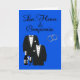 Convide suas procuras com um convite alegre do casamento que caracteriza dois smoking com uma garrafa do champanhe e dos vidros. O fundo é azul com alianças de casamento juntadas.