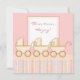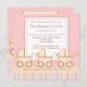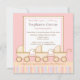 Três vezes a alegria! Aquele é o anúncio neste convite do chá de fraldas que caracteriza três carruagems de bebê adoráveis com as listras cor-de-rosa, azuis, amarelas, e marrons em um fundo cor-de-rosa.