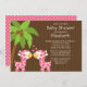 Comece seu chá de fraldas do safari de selva dos gêmeos do múltiplo fora do direito com nosso convite gêmeo moderno do chá de fraldas da menina que caracteriza um par de girafa cor-de-rosa & branco doce com uma palmeira & as borboletas ajustadas em um fundo marrom à moda. A parte traseira do convite caracteriza bolinhas cor-de-rosa de coordenação. Nossos convites bonitos do chá de fraldas do girafa são o safari perfeito convidam para um chá de fraldas gêmeo da menina e têm o obrigado de harmonização você os cartões, os selos postais & as etiquetas de nota disponíveis em nossa loja no design do ©Zenware de www.celebrateitinvites.com