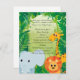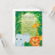 Este convite precioso do chá de fraldas é uma maneira maravilhosa de convidar seus convidados a juntar-se lhe em comemorar sua chegada nova. Este design tem um fundo da selva. Em torno da beira são um girafa, um leão, e um elefante do bebê. Apenas adicione seus detalhes do chá e você está pronto para ir!