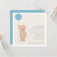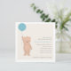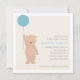 Um convite do chá de fraldas que caracteriza um urso de ursinho que flutua afastado em um balão.