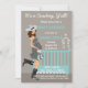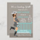 Convite do chá de fraldas do vaqueiro que caracteriza um brunette de espera que veste um chapéu de vaqueiro, botas de vaqueiro e guardarando um par de botas de vaqueiro do bebê. Este design adorável é perfeito para um chá de fraldas ocidental quando um menino é esperado.